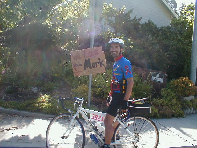 On Day 2, both of my highlights happened here in Soquel. At the Montessori pre-school all the kids were out along the road chanting “go riders” and holding out their hands to give each rider a “high 5” as you rode past. Just past the school, and before I had fully regained my composure, I came upon Mike, with Joantha and Kaitlin, cheering on the riders and waiting for me. There was a wonderful sign on the road wishing “Uncle Mark” well on the ride. By the time I reached Aptos, Julie and Debbie from work had been forced to abandon their cheering station to go to the office. I stopped in the office for a quick “Hi” though, as the detour only added about 4 blocks to my total mileage for the day. This was our highest mileage day, at 102 miles. I also concluded that I didn't really have to sample every snack at each pit stop, despite all the goodies offered (including mountains of fresh fruit, Cliff Bars, pretzels, trail mix, chips, fruit bars, etc, etc.).