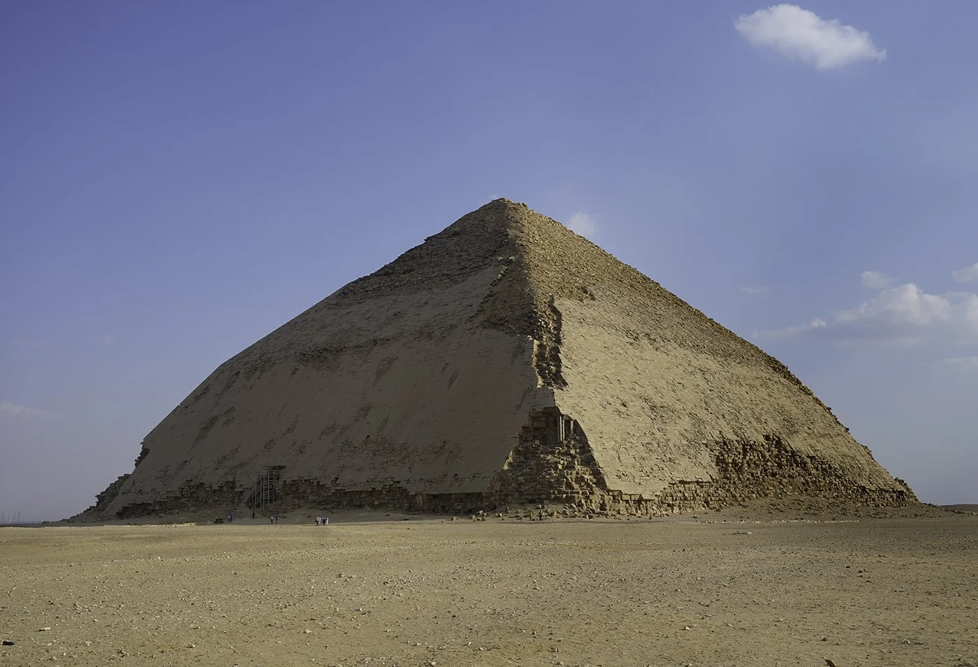 The Bent Pyramid is one of the oldest in Egypt; limestone construction rises 344 feet in height, with an angle of 54 degrees below the bend, and a more gentle 43 degrees above. Soqqara. 26th century BC
