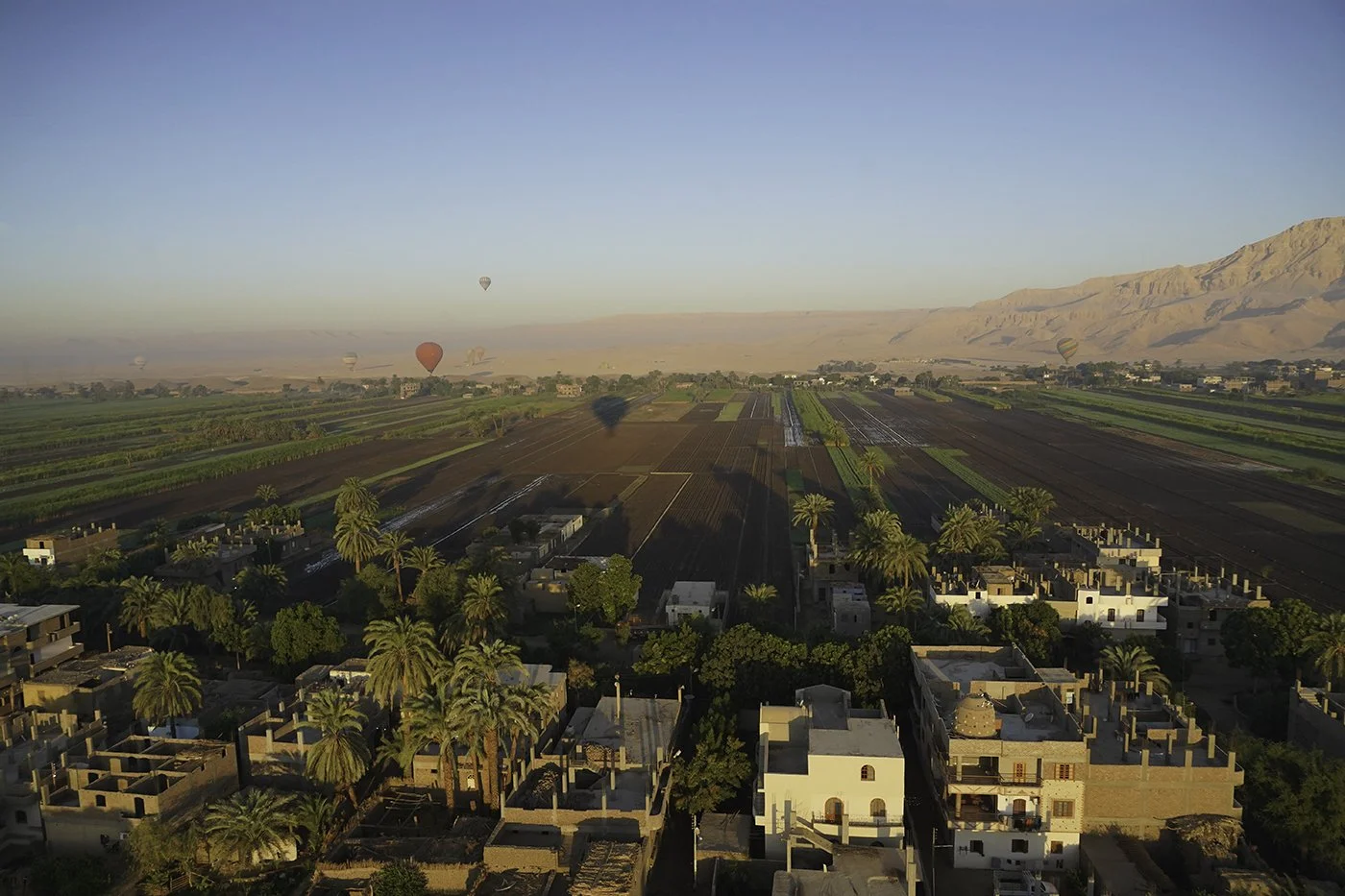 Sunrise over the Valley of the Kings, Temple of Queen Hatshepsut, Luxor archeological sites, and the surrounding quiet villages and fields.