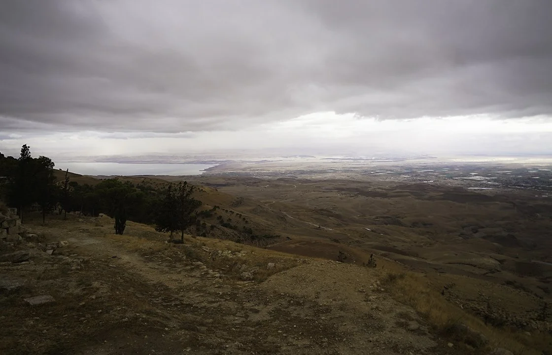 The view from atop Mt. Nebu, from where Moses looked out over the Promised Land. That’s the Dead Sea to the left, and the River Jordan is the swath of green extending to the right. Just peeking out of the mist and fog in the distance is the city of Jericho in the West Bank.