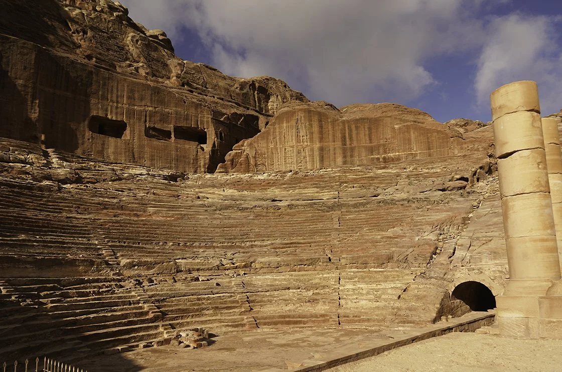 The Petra theater was mostly carved from solid rock, while the outer wall was constructed of blocks. Roman in design, with similar acoustics, it was constructed at the apex of the Nabataean kingdom (between 9-40AD)