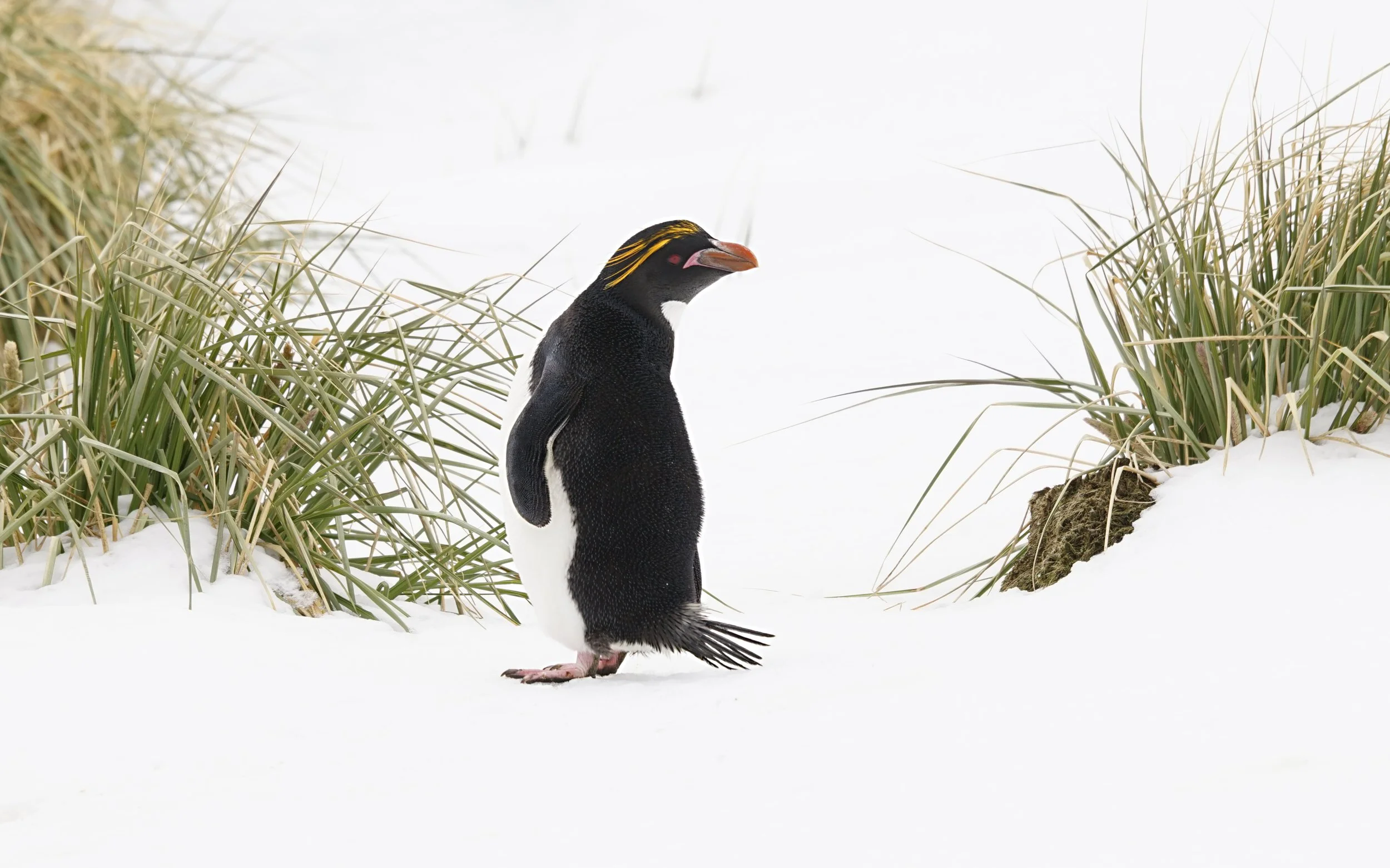Macaroni Penguins, like most penguins, need an area free of snow to nest. This guy seems to have come ashore a bit early