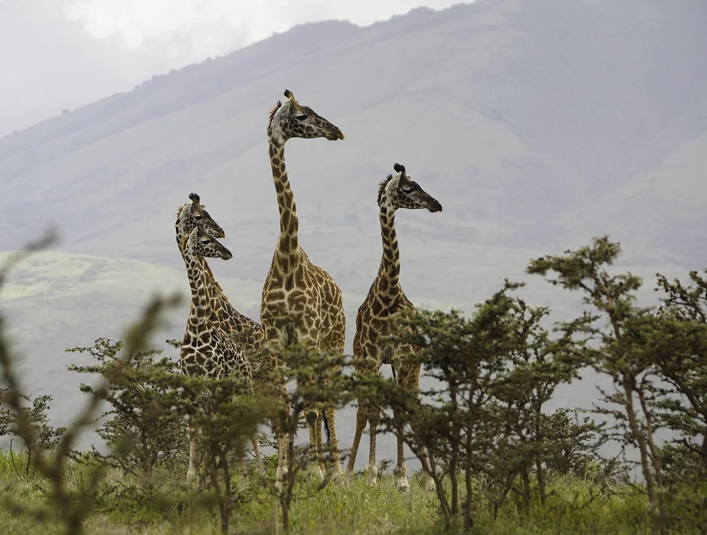 Outside the caldera we are still in the Ngorongoro Conservation Area, which extends all the way to the Southern Serengeti. These outer flanks were “crowded” with giraffe, many eating foliage of their favorite trees - the whistling thorn acacia (despite ants which live the tree tops and spray an acid at the giraffes to try and fend them off).