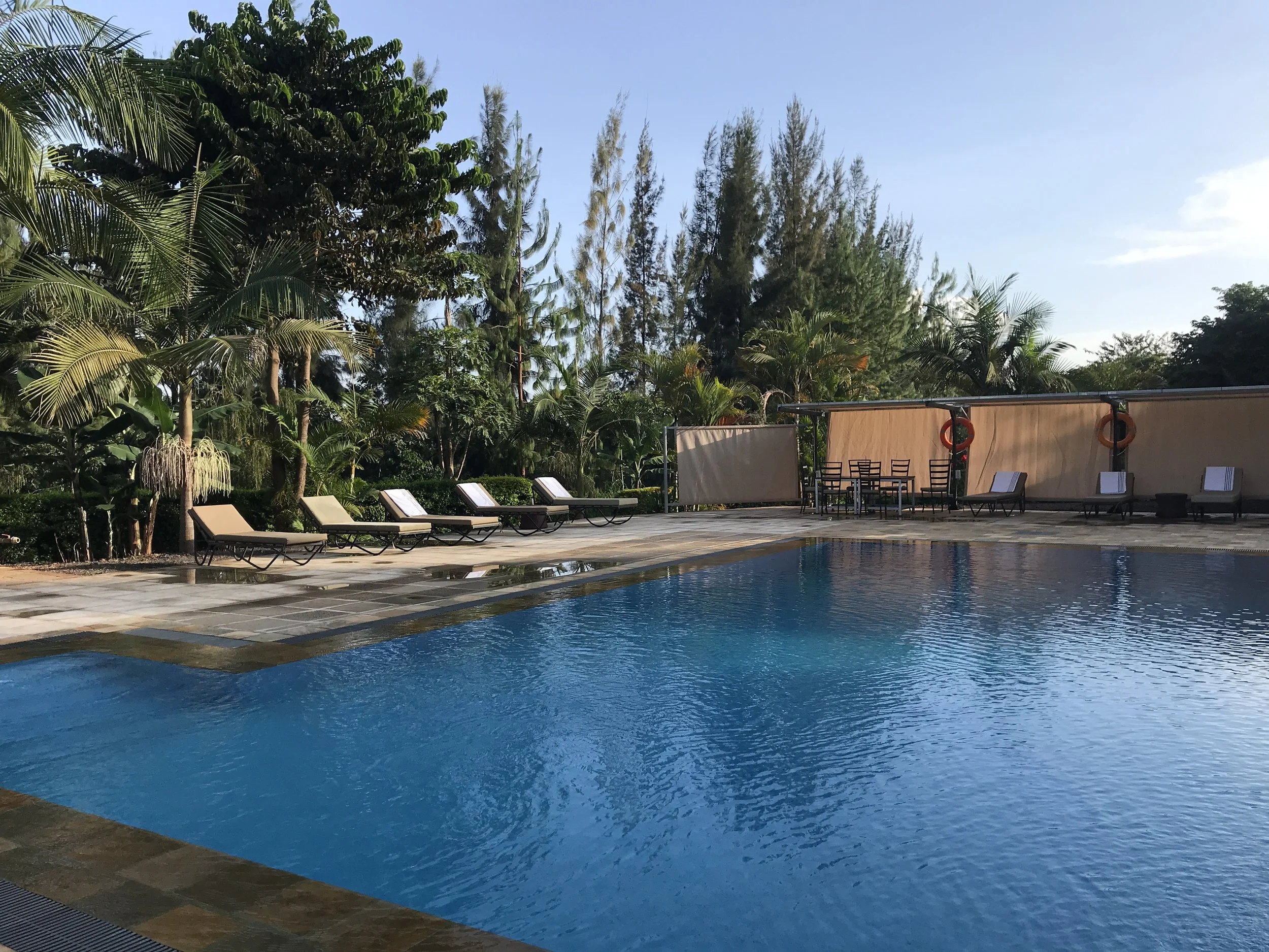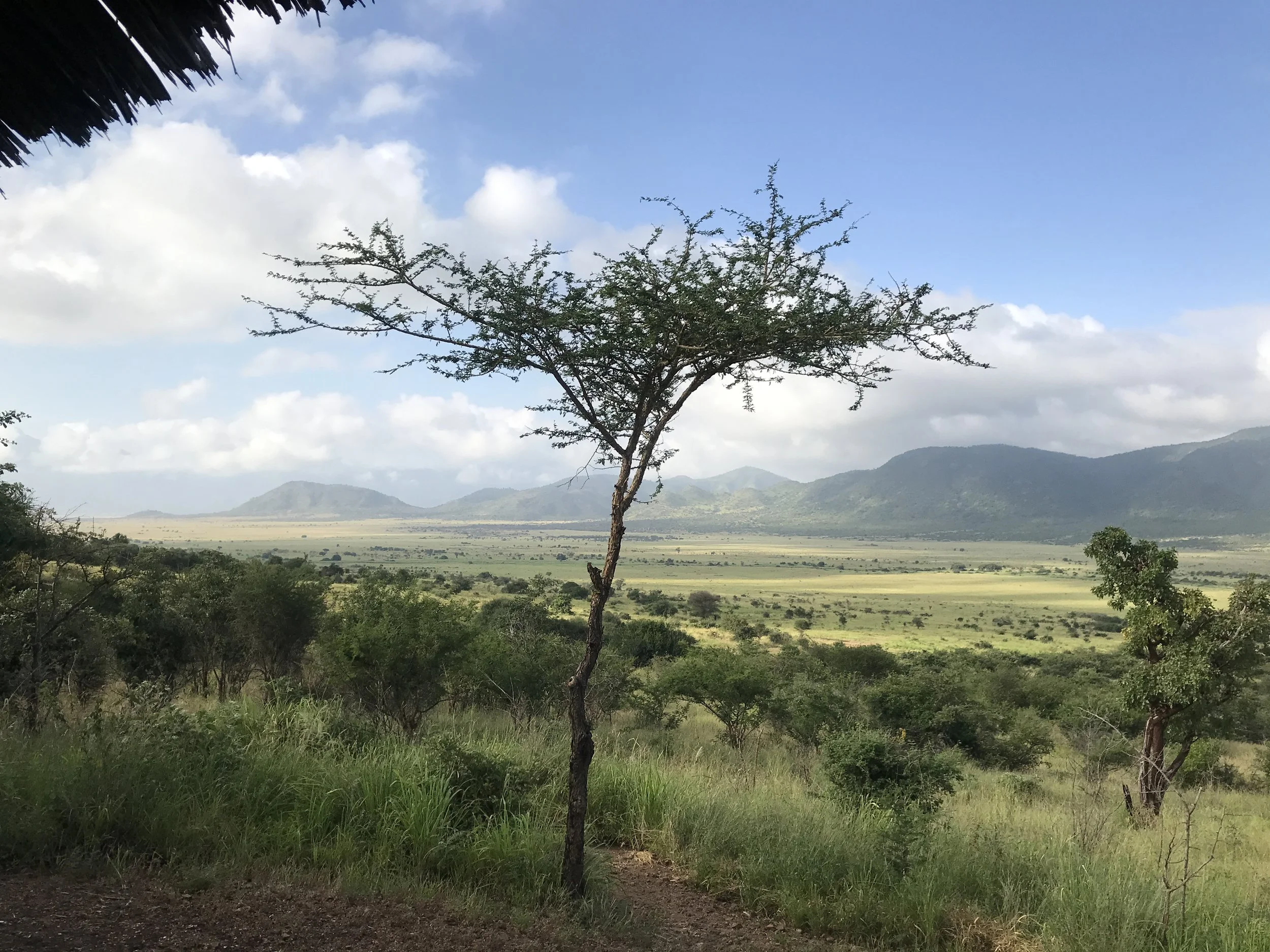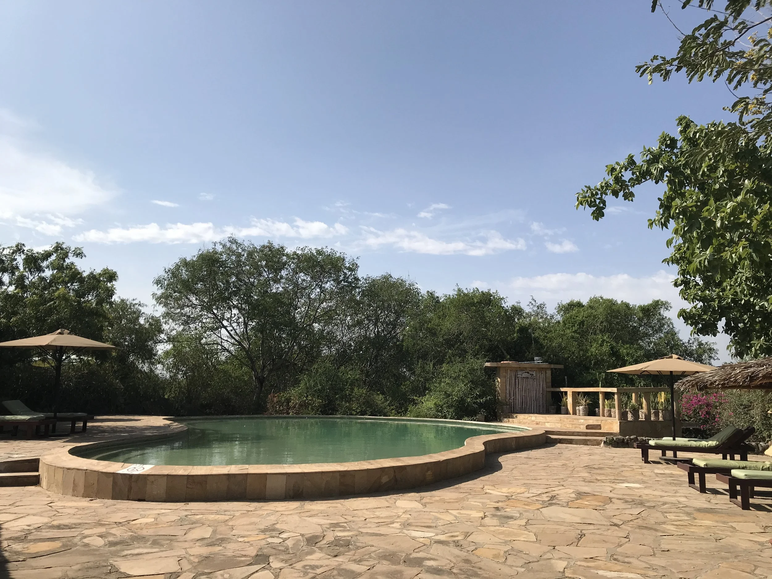 The Kia Lodge is so close it almost feels like it’s on the airport property. In reality it’s on a small hill next to the airport. Rooms are African-style thatched brick cottages scattered across the property, largely hidden from each other by a brushy native landscape. Lots of space in the rooms, including tons of space to spread out open suitcases. Hot showers and good AC! The ceiling fan however makes more noise than some prop planes I suspect! There’s a pool on the hilltop, complete with a view of Kilimanjaro. A lovely open air, thatched-roof, bar is perfect for relaxing with a beer or enjoying lunch (this is also where the WiFi signal is the strongest). We never went inside the restaurant as the adjacent terrace was a lovely spot to eat and the weather was consistently nice. Our first day was spent at the lodge, roaming no farther than the pool, lounge, restaurant, and gift shop.