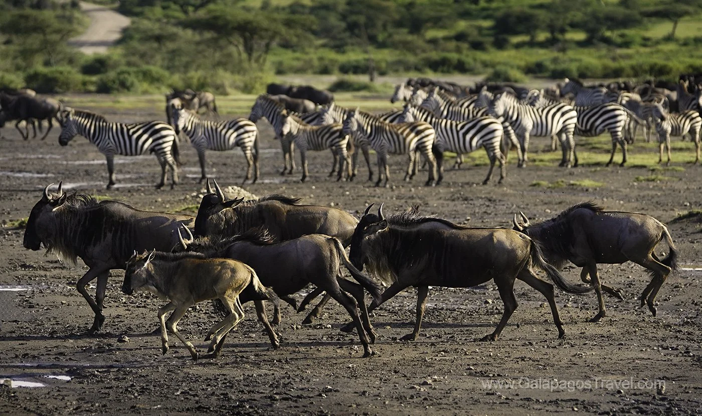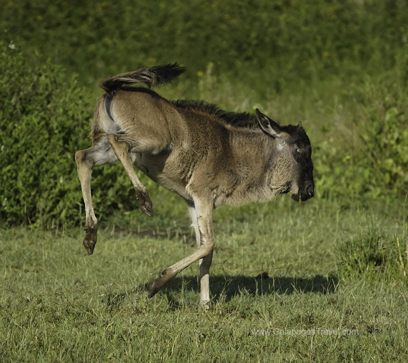 baby wildebeest are typically on their feet and able to run with the herd 3 minutes after birth. It might take a bit longer to get the coordination down though! (Serengeti National Park)