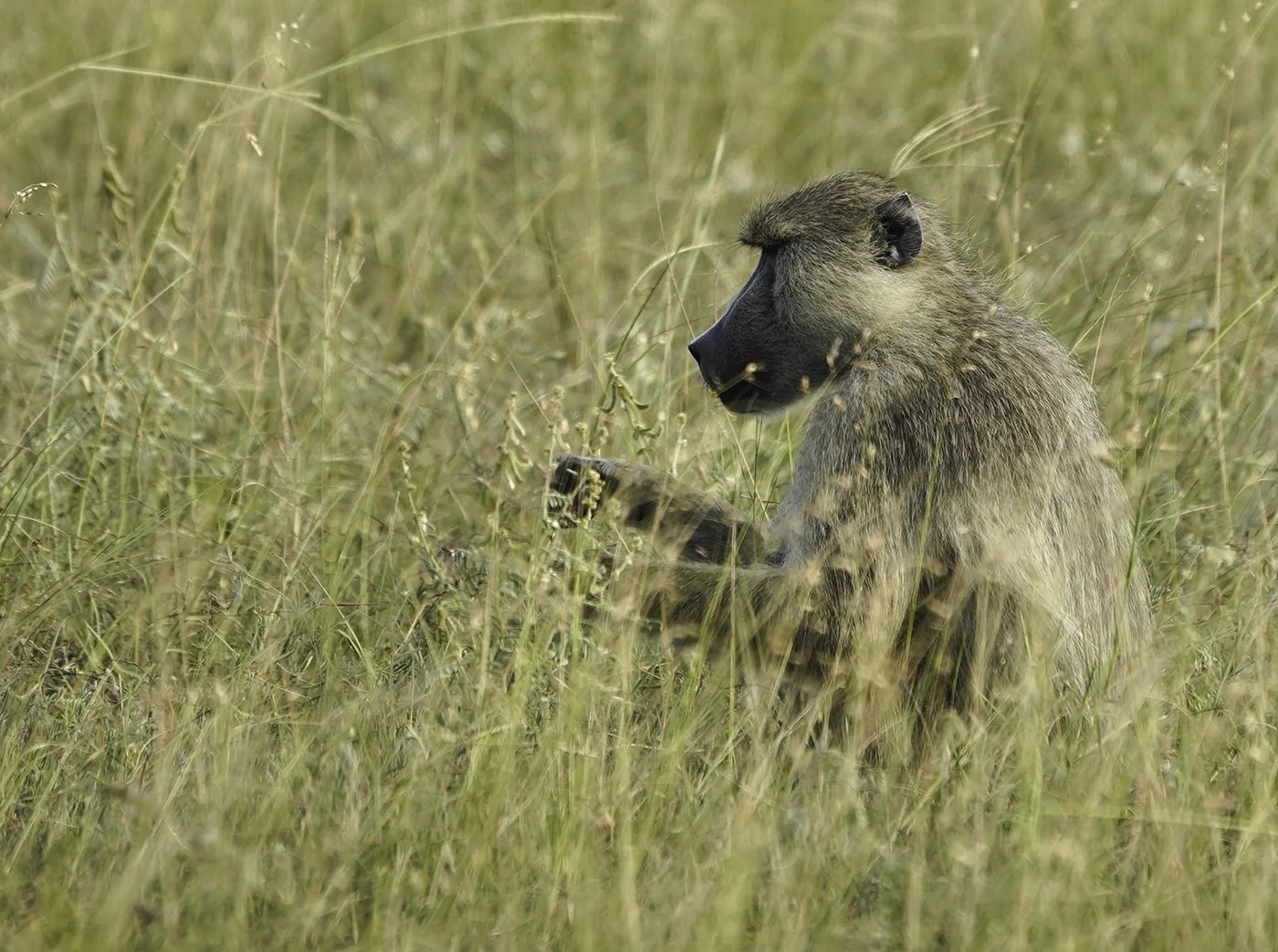 we came across a troop of baboons sitting in the grass, gently stripping off the seeds. (Saadani National Park)